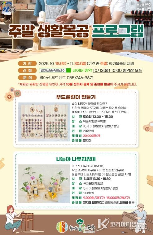 코리아타임뉴스 경남취재본부 | 진주시는 오는 18일부터 ‘월아산 숲속의 진주’에서 시민들의 다양한 목공체험과 이를 실용적 생활목공의 경험으로 확대하기 위한 ‘주말 생활목공’ 프로그램을 운영한다고 밝혔다.