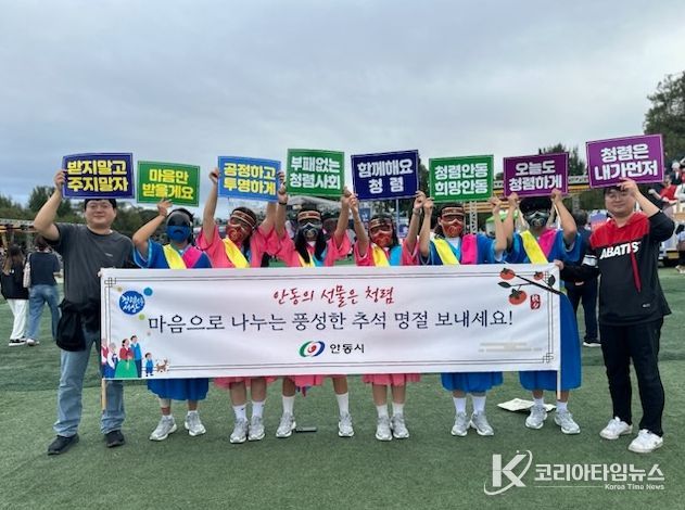 이번 캠페인은 10월 4일 안동탈춤축제장에서 ‘안동의 선물은 청렴, 마음으로 나누는 풍성한 추석 명절 보내세요’라는 슬로건 아래 진행됐으며, 시민과 공직자가 함께 청렴 실천을 다짐하는 퍼포먼스를 통해 청렴문화 확산에 앞장섰다.