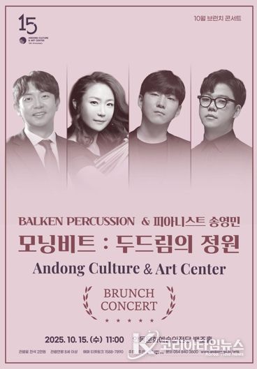 코리아타임뉴스 윤경수 기자 | 안동문화예술의전당은 매월 둘째 주 수요일, 클래식 애호가들을 위한 감성 콘서트 시리즈인 ‘브런치 콘서트’를 꾸준히 선보이며 지역 문화 활성화에 앞장서고 있다. 10월의 브런치 콘서트, '모닝비트: 두드림'이 오는 10월 15일 오전 11시, 안동문화예술의전당 백조홀에서 열린다.