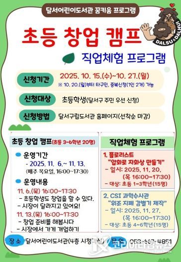 코리아타임뉴스 한장선 객원기자 | 대구 달서구는 초등학생들의 창의적 사고력과 진로 탐색 능력을 키우기 위해 오는 11월 ‘꿈 키움 체험 프로그램’을 운영하고, 10월 15일부터 27일까지 참가자를 모집한다.