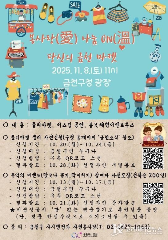 코리아타임뉴스 노승선 기자 | 금천구는 오는 11월 8일 금천구청 광장 앞에서 ‘봉사랑(愛) 나눔ON(溫), 당신의 금천마켓’을 연다고 밝혔다.