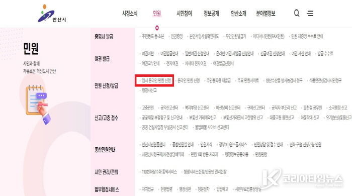 코리아타임뉴스 윤광희 기자 | 안산시는 지난 13일부터 ‘국민신문고’ 시스템 장애에 대응해 안산시청 누리집에 ‘임시 온라인 민원 신청’ 창구를 설치하고 운영을 시작했다고 14일 밝혔다.