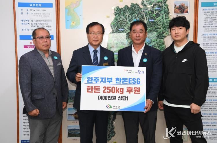 코리아타임뉴스 전북취재본부 | (사)대한한돈협회 완주지부가 완주군에 400만 원 상당의 돼지고기 전지 250kg를 전달했다.