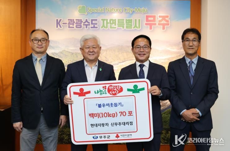 코리아타임뉴스 전북취재본부 | 현대자동차 신무주대리점은 지난 13일 무주군에 쌀 70포대(1포대 10kg)를 지정 기탁하며 훈훈함을 전했다.