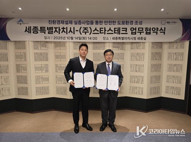 코리아타임뉴스 세종취재분부 | 세종특별자치시가 14일 시청 세종실에서 ㈜스타스테크(대표 양승찬)와 업무협약을 체결해 3년간 총 1200t의 친환경 제설제를 지원받는다.