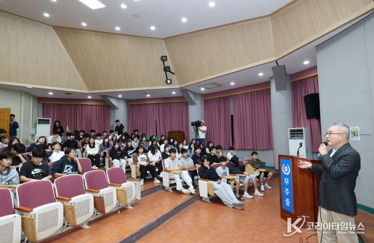 무주중학교 시청각실에서 개최된 이날 행사는 지역 내 학생들의 독서문화를 선도하고 인문학적 소양 증진에 기여하기 위해 마련된 것으로, 2025 무주군 올해의 책으로 선정된 청소년 부문 도서, “인권을 들어 올린 스포츠 선수들”의 저자 최동호 작가가 진행했다.