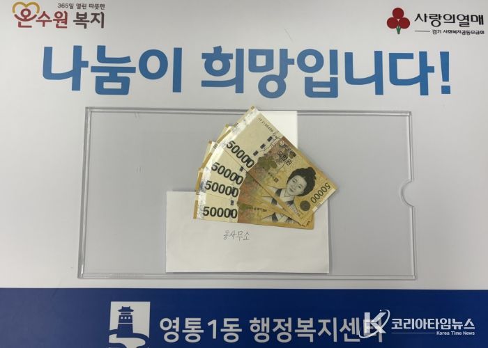 코리아타임뉴스 사회팀 | 수원특례시 영통구 영통1동 행정복지센터는 사례관리대상자로 지원을 받아왔던 한 주민이 다른 동의 임대주택으로 이주하게 되어 그동안의 지원에 대한 감사의 뜻으로 20만 원을 기부했다고 밝혔다.