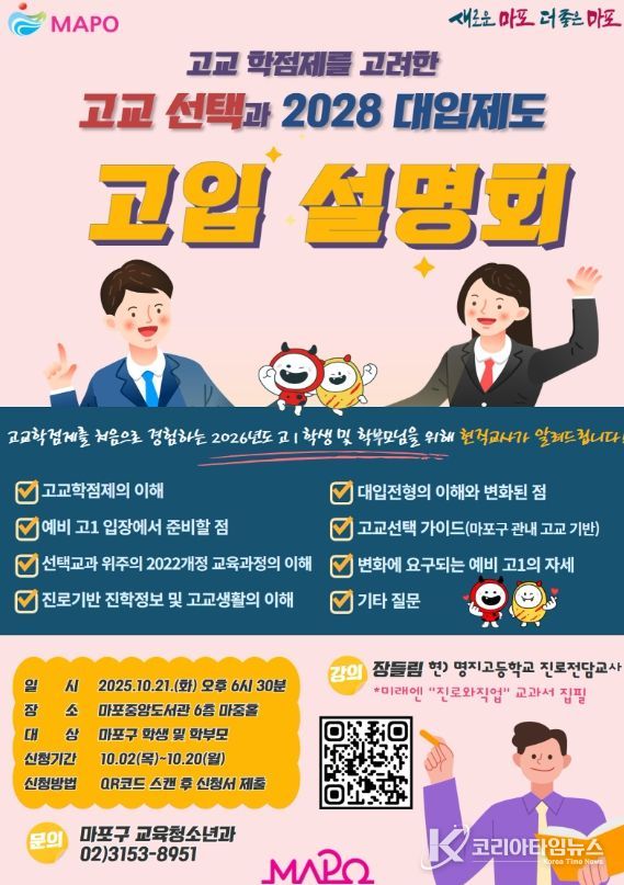 코리아타임뉴스 노승선 기자 | 마포구는는 10월 21일 오후 6시 30분, 마포중앙도서관 6층 마중홀에서 ‘2026학년도 고입설명회’를 개최한다.