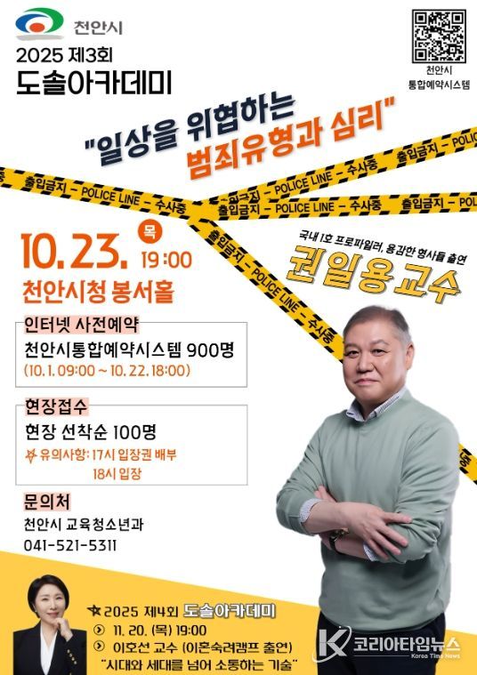 코리아타임뉴스 김택호 기자 | 천안시는 오는 23일 오후 7시 천안시청 봉서홀에서 ‘일상을 위협하는 범죄유형과 심리’를 주제로 권일용 교수를 초청해 도솔아카데미 강연을 진행한다고 16일 밝혔다.