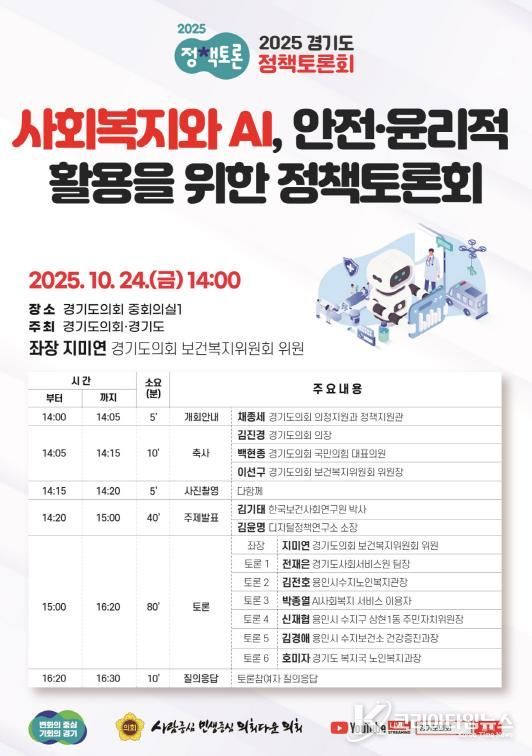 행사는 경기도의회, 경기도가 공동 주최하며, 지미연 의원이 좌장을 맡아 진행한다. 이날 행사에는 학계, 공공기관, 보건의료 분야, 주민 대표, 경기도 담당부서 등 다양한 분야의 전문가들이 참석해 사회복지 영역에서의 AI 기술 안전 활용 방안과 제도적 개선 방향을 논의할 예정이다.