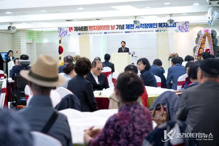 코리아타임뉴스 충북취재본부 | (사)충북시각장애인복지연합회 제천시지회(회장 조용록)는 지난 16일 명성유유웨딩컨벤션에서 ‘제46회 흰 지팡이의 날’ 기념식을 개최했다. 흰 지팡이는 시각장애인에 대한 사회적 보호와 안전, 자립을 상징한다.