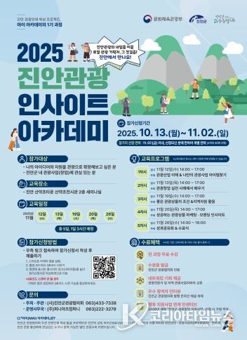 코리아타임뉴스 전북취재본부 | (사)진안군관광협의회는 오는 11월 12일부터 26일까지 2주간 진안 산약초타운 2층 세미나실에서 마이아카데미 1기 ‘진안관광 인사이트 아카데미’를 개최한다.