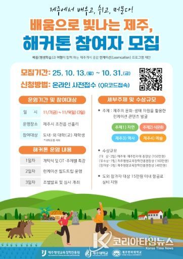 코리아타임뉴스 노승선 기자 | 제주평생교육장학진흥원은 '제주가치 공감, 런케이션'사업의 일환으로 ‘배움으로 빛나는 제주, 해커톤’을 개최하며, 오는 10월 31일까지 참가자를 모집한다고 밝혔다.