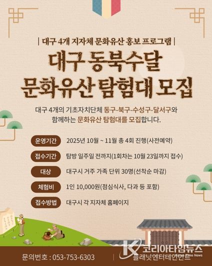 코리아타임뉴스 대구취재본부 | 대구 수성구, 동구, 북구, 달서구가 협력해 지역의 역사와 문화를 함께 배우고 체험하는 ‘대구 문화유산 탐험대’ 운영을 시작한다.
