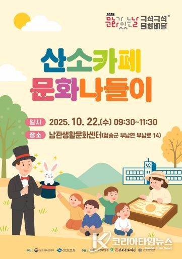 코리아타임뉴스 경북취재본부 | (재)청송문화관광재단은 오는 10월 22일과 11월 25일 청송군 부남면 남관생활문화센터에서 2025 문화가 있는 날 '구석구석 문화배달' 사업의 일환으로 ‘산소카페 문화나들이’ 행사를 개최한다.