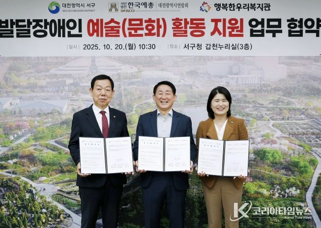 코리아타임뉴스 윤경수 기자 | 대전 서구는 발달장애인 문화예술 활동 지원을 위해 (사)한국예총 대전광역시연합회 및 행복한우리복지관과 3개 기관 업무협약을 체결했다고 20일 전헀다.