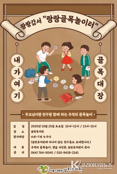 코리아타임뉴스 사회팀 | 제주도교육청 남원유치원은 25일 오전 10시와 오후 1시, 두 차례에 걸쳐 남원유치원에서 지역공동체 교육 프로그램인 ‘왕봥갑서 랑랑골목놀이터’를 운영한다.