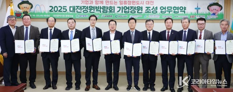 코리아타임뉴스 대전취재본부 | 대전시는 22일 대전시청 중회의실에서 ‘2025 대전정원박람회’의 성공적 개최를 위해 기업정원 조성 업무협약을 체결했다.