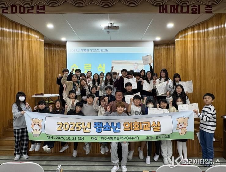코리아타임뉴스 윤광희 기자 | 경기도의회 건설교통위원회 안명규 의원(국민의힘, 파주5)은 10월 21일 파주송화초등학교 시청각실에서 열린 ‘제36회 청소년의회교실’에 참석해 파주 송화초등학교 학생들과 함께 모의의회를 체험하며 민주주의의 가치와 의회의 역할을 함께 나누는 뜻깊은 시간을 가졌다.