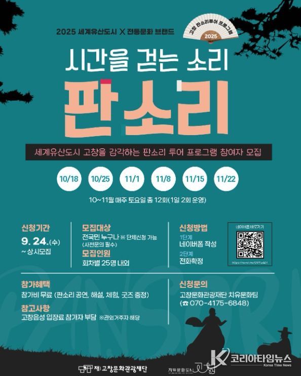 코리아타임뉴스 전북취재본부 | 고창문화도시센터가 판소리 투어 프로그램 ‘시간을 걷는 소리:판소리’를 오는 11월 22일까지 매주 토요일마다 2차례씩 운영한다.