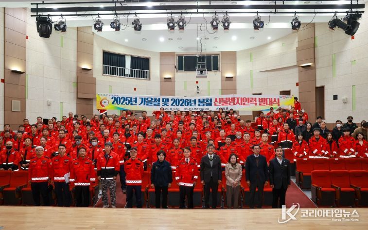 코리아타임뉴스 경북취재본부 | 청도군은 11월 6일 청소년수련관 다목적홀에서 산불전문예방진화대 및 감시진화대 등 산불방지인력과 관계 공무원 170여 명이 참석한 가운데 ‘2025년 가을철 및 2026년 봄철 산불방지인력 발대식’을 개최했다.