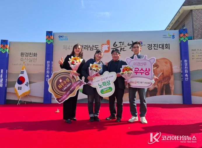 코리아타임뉴스 전남취재본부 | 곡성군은 지난 6일 순천광양축협에서 열린‘2025년 제41회 전라남도 으뜸한우 경진대회’에서 고급육 부문 옥과면 최하나 농가가“최우수상”, 우량한우(미경산우) 부문 목사동면 조신익 농가가 “최우수상”, 우량한우(암송아지) 부문 겸면 이금숙 농가가 “노력상”을 받는 쾌거를 이뤘다고 10일 밝혔다.