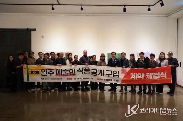 코리아타임뉴스 전북취재본부 | (재)완주문화재단은 10월 31일 복합문화지구 누에아트홀에서 [2025 완주 예술인 작품 공개 구입] 최종 선정 작가들과 작품 구입 계약 체결식을 개최했다.