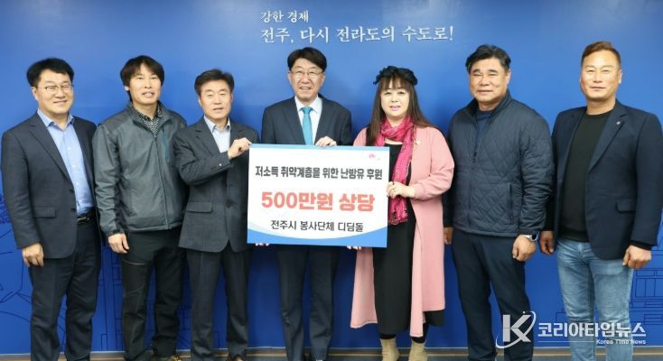 코리아타임뉴스 김태훈 기자 | 전주지역 봉사단체인 ‘디딤돌’(회장 박지윤)은 17일 전주시장실을 찾아 지역 저소득 취약계층 20세대에 전달할 예정인 500만 원 상당의 등유 쿠폰 사용권을 기탁했다.