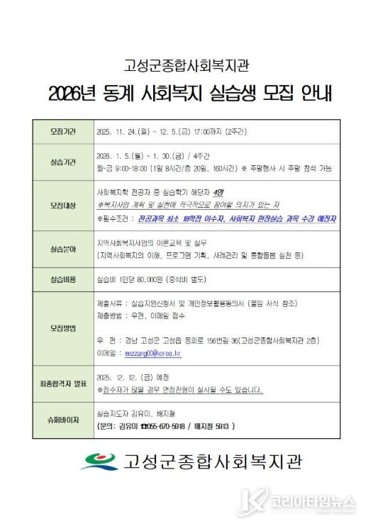 코리아타임뉴스 경남취재본부 | 고성군이 운영하는 고성군종합사회복지관은 2025년 11월 24일부터 12월 5일까지 2주간 2026년 동계 사회복지 현장 실습생을 모집한다고 밝혔다.