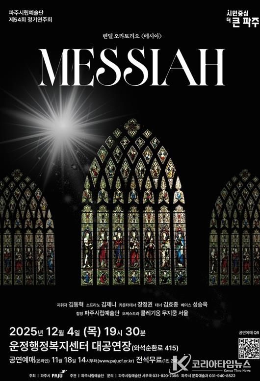 코리아타임뉴스 기동취재팀 | 파주시는 오는 12월 4일 19시 30분, 운정행복센터 대공연장에서 시립예술단 제54회 정기연주회 ‘헨델 오라토리오 '메시아'’를 선보인다고 밝혔다.