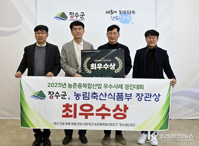 코리아타임뉴스 김태훈 기자 | 장수군은 18일 농림축산식품부가 주관한 ‘2025년 농촌융복합산업 우수사례 경진대회’에서 ‘농촌융복합산업지구’ 분야 ‘최우수상’을 수상했다고 밝혔다.
