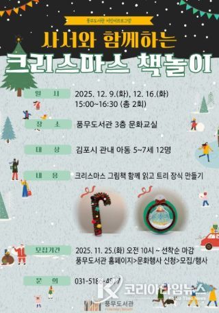 코리아타임뉴스 문화팀 | 김포시 풍무도서관은 ‘사서와 함께하는 크리스마스 책놀이’프로그램을 12월 9일과 16일 오후 3시부터 4시 30분까지 운영한다.