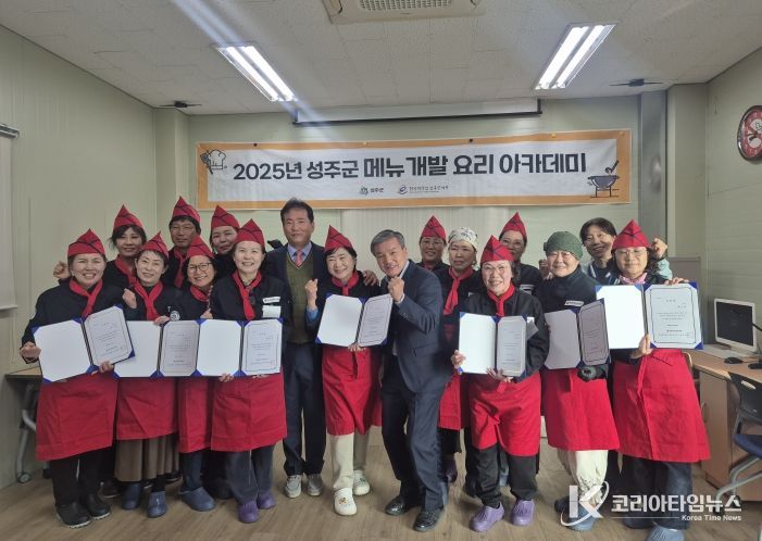 코리아타임뉴스 경북취재본부 | 성주군은 19일 성주군농업기술센터 조리실습장에서 일반음식점 영업자 20명을 대상으로 운영한 ⌜2025년 외식업 영업자 메뉴개발 요리아카데미⌟ 수료식을 가졌다.