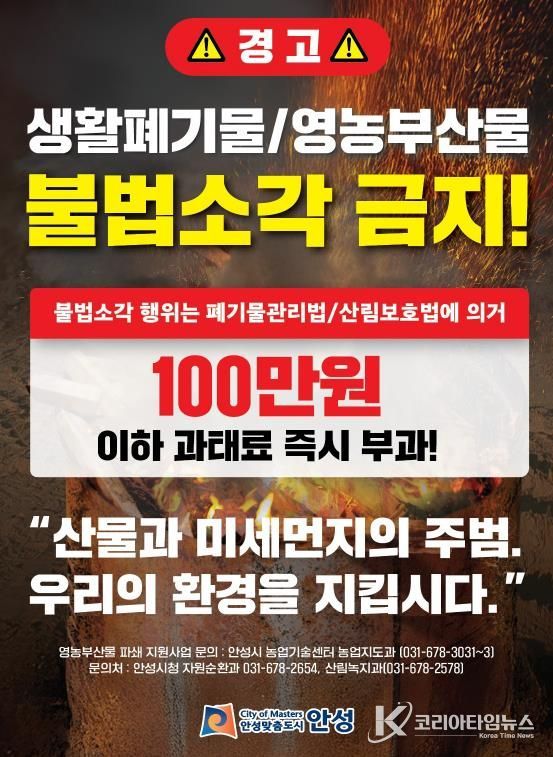 코리아타임뉴스 경기취재본부 | 안성시가 12월 12일까지 농촌지역 영농폐기물, 생활쓰레기 등 불법소각 행위에 대하여 강력한 단속을 한다고 밝혔다.