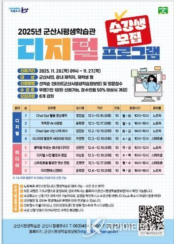 코리아타임뉴스 김태훈 기자 | 군산시평생학습관이 디지털 대전환 시대에 발맞춰 시민들의 정보 활용 능력과 디지털 기기 활용 역량 강화를 위한 ‘디지털 프로그램’ 수강생을 모집한다.