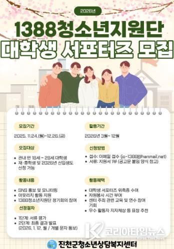 코리아타임뉴스 충북취재본부 | 충북 진천군청소년상담복지센터는 이달 24일부터 대학생 대상 서포터즈 프로그램 ‘2026년 1388청소년지원단 대학생 서포터즈’ 참가자를 모집한다고 밝혔다.