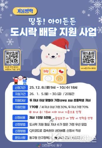 코리아타임뉴스 대전취재본부 | 대전 동구는 방학기간 동안 맞벌이 가정의 양육 공백을 해소하고 초등학생 자녀의 균형 잡힌 식사를 지원하기 위해 ‘겨울방학 띵동! 아이든든 도시락 배달 지원사업’의 신청자를 모집한다고 24일 밝혔다.