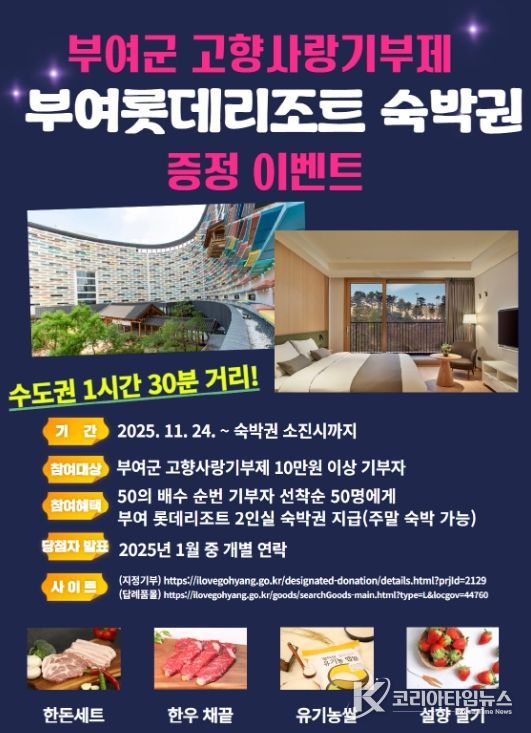 코리아타임뉴스 충남취재본부 | 부여군은 고향사랑기부제 참여를 확대하고 지역 관광 활성화를 도모하기 위해 11월 24일부터 숙박권 소진 시까지 ‘부여롯데리조트 숙박권 증정 이벤트’를 추진한다고 밝혔다.