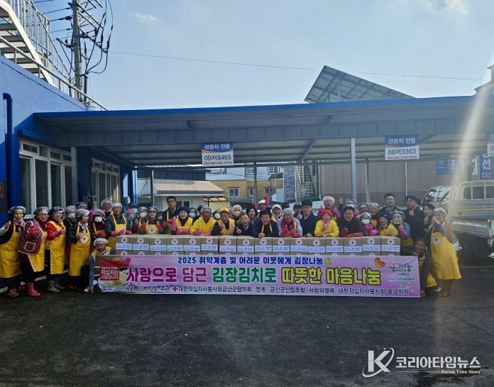 코리아타임뉴스 충남취재본부 | 대한적십자봉사회 금산군지회(회장 서혜경)는 지난 24일 금산읍행정복지센터에서 봉사원 및 지역주민 50여 명이 참여한 가운데 사랑의 김장 나눔에 나섰다.