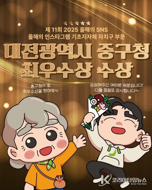 코리아타임뉴스 대전취재본부 | 대전 중구는 26일 한국프레스센터에서 열린 ‘올해의 SNS’시상식에서 기초지자체(자치구) 인스타그램 부문 최우수상을 수상했다고 밝혔다.