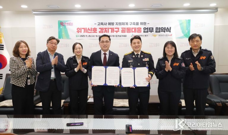 코리아타임뉴스 대전취재본부 | 대전 동구는 26일 구청장 접견실에서 대전 동부소방서(서장 이준서)와 ‘위기신호 감지가구 공동대응’ 업무협약을 체결했다고 밝혔다.