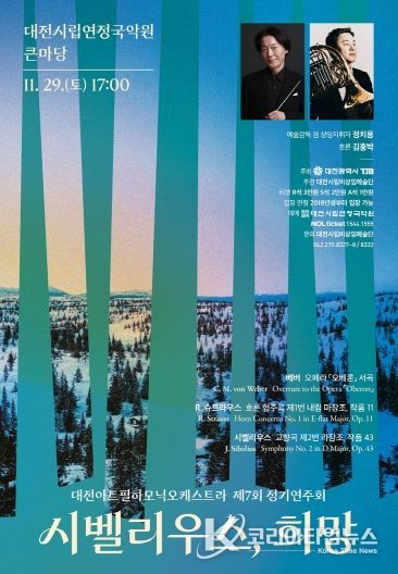 연주회의 대미를 장식할 시벨리우스‘교향곡 제2번’은 넓게 펼쳐진 선율과 북유럽 특유의 서정성, 그리고 마지막 악장에서 폭발하는 승화의 정서가 압도적인 감동을 선사한다. 정치용 지휘자의 견고한 해석과 대전아트필의 응집력 있는 사운드는 이 교향곡이 지닌 장대한 스케일을 설득력 있게 전달할 것이다.