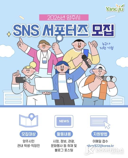 코리아타임뉴스 윤광희 기자 | 양주시가 시민과 소통하며 시정 소식과 지역의 숨은 매력을 널리 알릴 '2026년 양주시 SNS 서포터즈'를 오는 12월 1일부터 10일까지 10일간 모집한다.