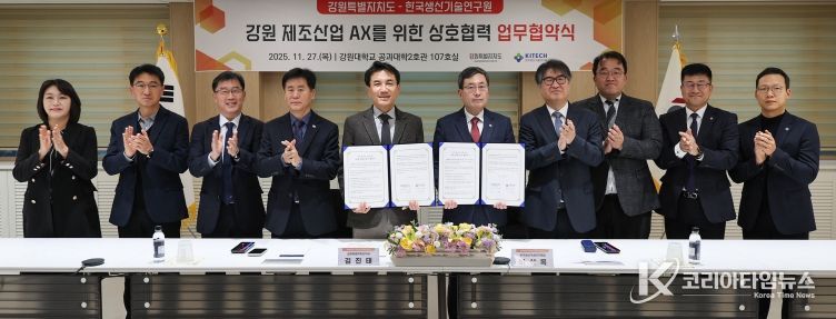 코리아타임뉴스 김택호 기자 | 강원특별자치도는 11월 27일 오후 3시, 강원 제조산업의 AX(AI Transformation, 인공지능 전환)를 위한 상호 협력을 강화하기 위해 한국생산기술연구원(원장 이상목)과 업무협약(MOU)을 체결했다.