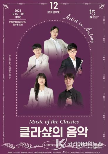코리아타임뉴스 노승선 기자 | 안동문화예술의전당은 지역예술인들에게 다양한 무대 경험을 제공하고, 시민에게는 일상 속 음악 향유할 수 있는 기회를 마련하고자, 매월 첫째 주 화요일 오전 11시에 로비음악회 시리즈를 진행하고 있다. 올해 마지막 로비음악회는 ‘클라샵’의 공연으로 12월 2일 오전 11시, 웅부홀 로비에서 '클라샾의 음악'이라는 제목으로 개최된다.
