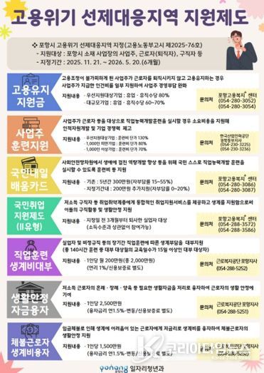 이강덕 포항시장은 “이번 ‘고용위기 선제대응지역’ 지정을 계기로 산업과 고용위기에 직면한 지역 기업과 근로자에게 실질적인 도움이 돌아가도록 제도를 꼼꼼히 알리겠다”며 “유관기관과 긴밀히 협력해 고용유지와 생계안정 지원이 현장에서 체감될 수 있도록 행정력을 집중하겠다”고 말했다.