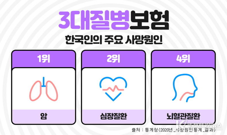 코리아타임뉴스 박찬식 기자 | 한국인의 주요 사망원인중에 암, 뇌혈관질환, 심혈관질환은 흔히 3대질병이라 일컬어지며 살아가면서 가장 먼저 대비해야 하는 중대질병으로 항상 강조되고 있다. 이들 질병에 미리 대비하기 위해 가입하는 것이 진단비보험인데, 이러한 3대질병진단비를 중점으로 보장하는 보장성보험이 3대진단비보험 이다. 3대질병진단비보험은 각각의 질병에 주목해서 보장하기도 하지만, 나에게 맞는 추가 특약을 잘 골라서 가입한다면 종합건강보험으로도 충분히 활용도가 높다.