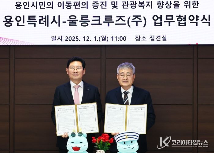 코리아타임뉴스 사회팀 | 용인특례시는 1일 시청 4층 접견실에서 울릉크루즈㈜와 ‘용인시민 이동편의 증진 및 관광복지 향상을 위한 업무협약’을 체결했다고 밝혔다.