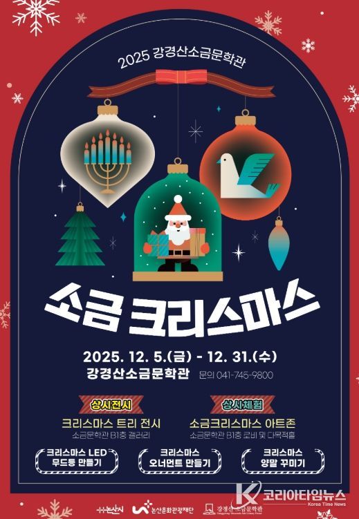 코리아타임뉴스 충남취재본부 | (재)논산문화관광재단이 주관하는 강경산 소금문학관이 크리스마스를 앞두고 관람객들에게 따뜻한 연말 분위기를 선사할 크리스마스 트리 전시와 특별 문화예술 프로그램을 선보인다.