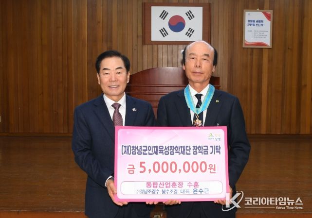 코리아타임뉴스 경남취재본부 | ㈜경남조경수 윤수근 대표가 지난 1일 (재)창녕군인재육성장학재단에 장학금 500만 원을 기탁했다고 밝혔다.